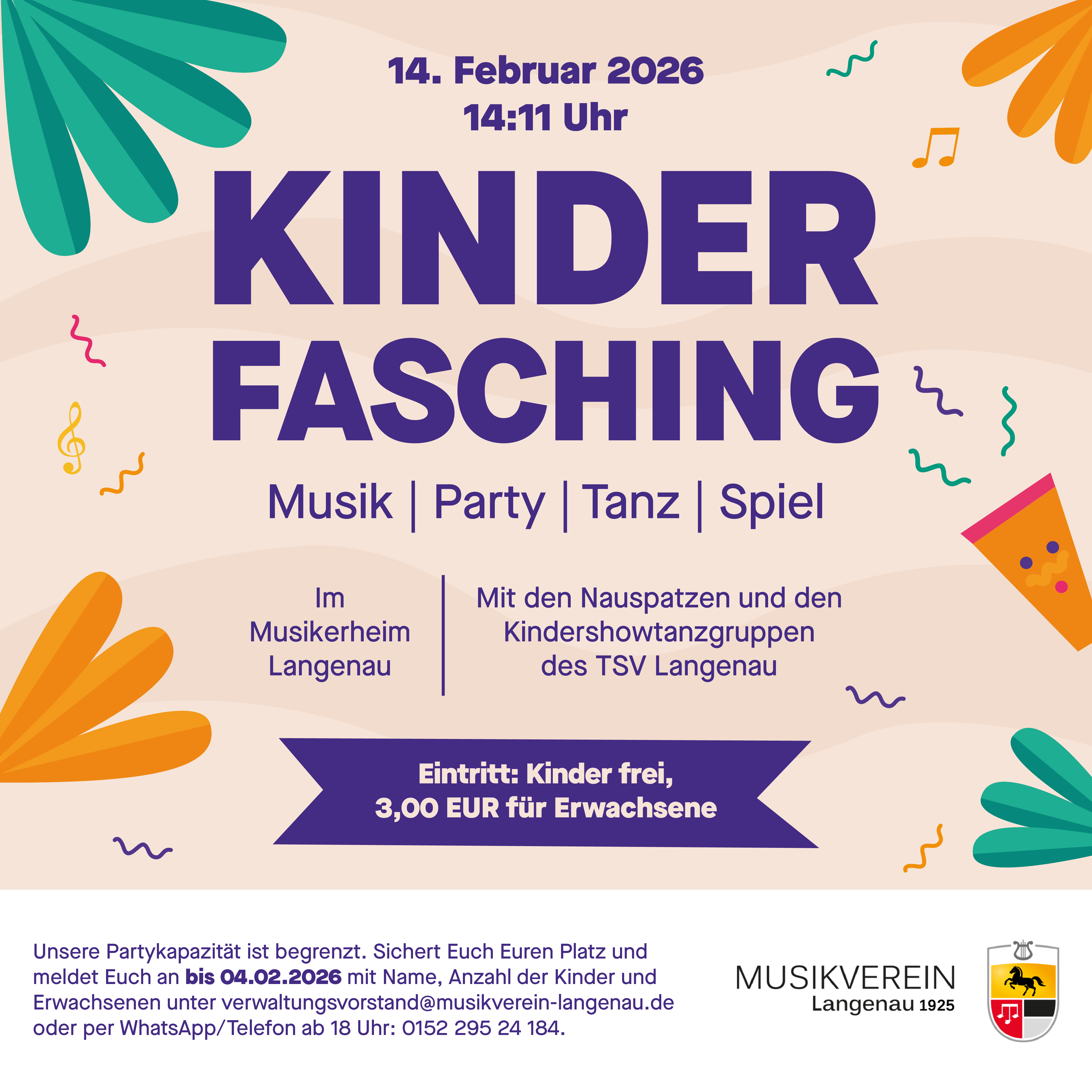 Wir laden Euch herzlich zum Kinderfasching am 14.02.2026 ins Musikerheim ein. Plätze sind bereits ausgebucht.
